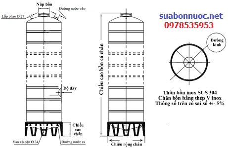 2 - Kích thước bồn nước inox 5000L đứng Hwata.